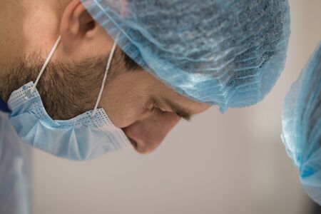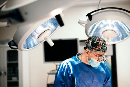 Surgeon doctor performing operation using special lamp lighting, wearing blue surgical mask