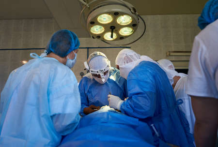 An international team of doctors performs a complex surgical operation on a patient under anesthesia. Modern operating room and experienced surgeons save lives.