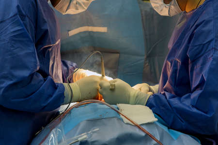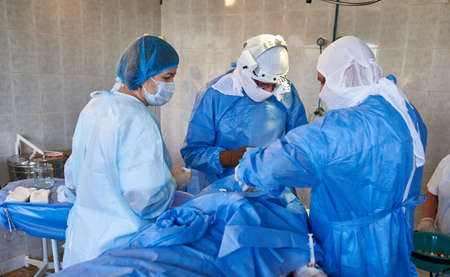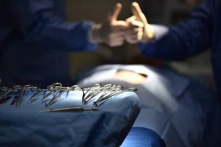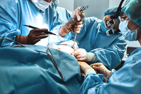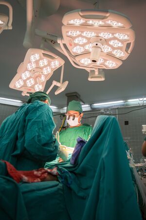 Team surgeon at work in operating room. Surgical light in the operating room. Preparation for the beginning of surgical operation with a cut. The surgeon is performing surgery on the patient.