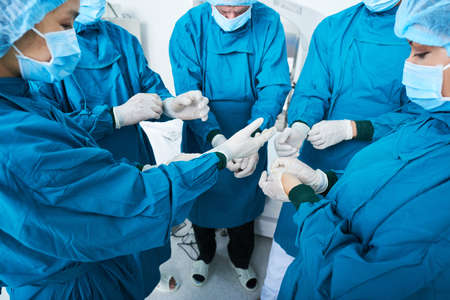From above shot of crop surgical team putting on latex gloves before performing surgery in hospital