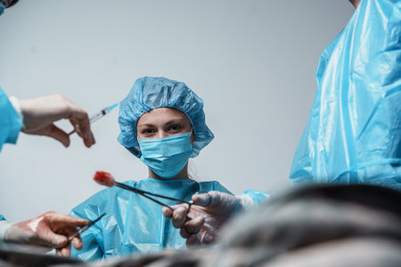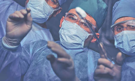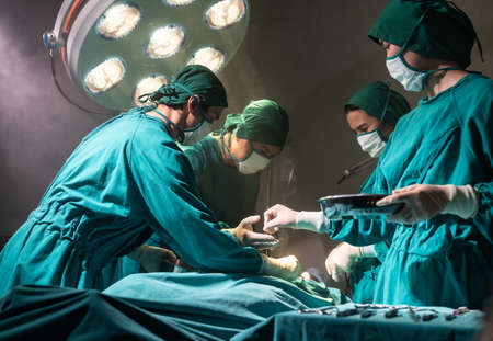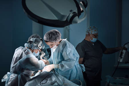 An international professional team of surgeon, assistants and anesthesiologist perform a complex operation on a patient under general anesthesia. Dark atmospheric photography theme in low key.