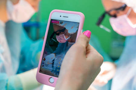 Theater of Surgery. The assistant conducts an online broadcast of a complex operation. Modern technology, modern medicine.