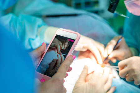 Assistant shooting on the smartphone from the operating room. Medical Team Performing Surgical Operation in Modern Operating Room