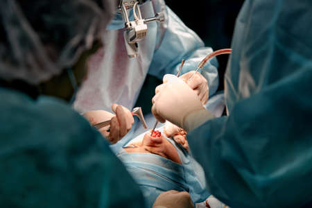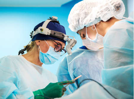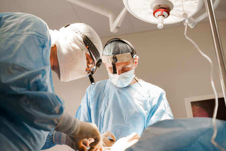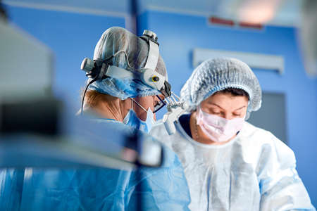 Surgeon and his assistant performing cosmetic surgery in hospital operating room. Surgeon in mask wearing loupes during medical procadure.