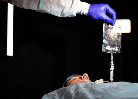 The doctor puts a dropper on the patient's girl to thin the blood and raise hemoglobin, background. Copy space for text