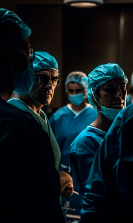 A group of doctors standing next to each other in an operating room in blue medical gowns and masks in artificial warm lighting. AI generated, AI generative, AI generativ.