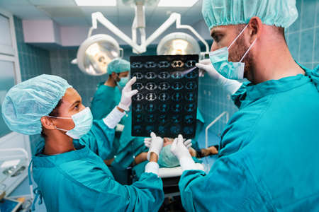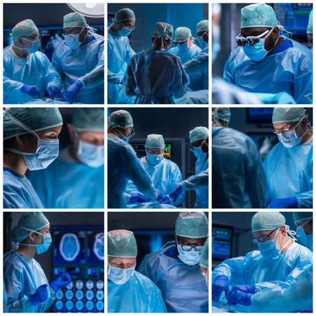 Multiracial team of professional medical surgeons performs the surgical operation in a modern hospital. Doctors are working to save the patient. Medicine, health and neurosurgery.