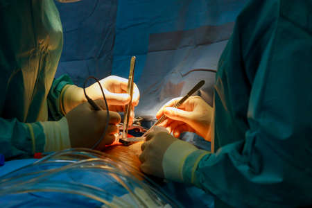 Operating room nurse send surgical equipment for surgeon doctor with Medical Team Performing Surgical Operation in Operating Room OR. Medical health care Surgery concept.