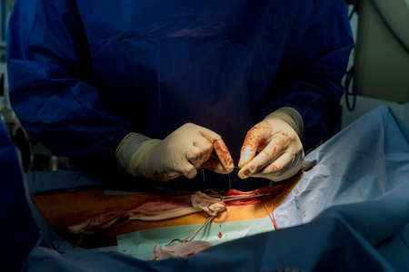 Surgeon begins to sew the wound on the leg after the operation emergency room.