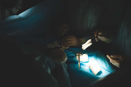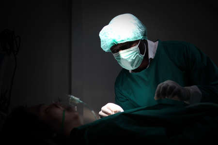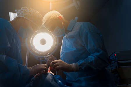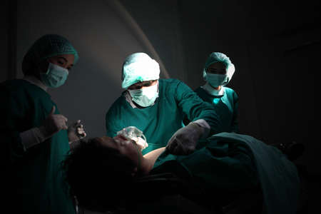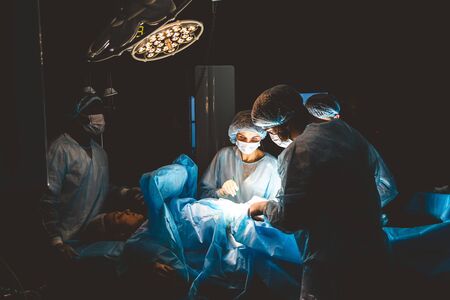 An international professional team of surgeon, assistants and anesthesiologist perform a complex operation on a patient under general anesthesia. Dark atmospheric photography theme in low key