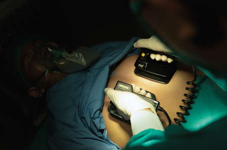 Selective focus at defibrillator while doctor use it to pump at chest of unconscious with low heart rate patient to save life while doing medical surgery inside of operating room. Emergency aid, CPR.