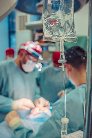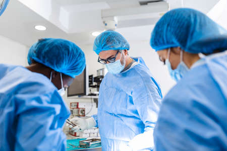 Group of surgeons in operating room with surgery equipment. Modern medical background. In surgery.