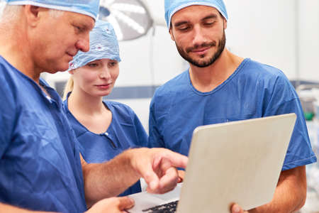 Surgery medical team with laptop computer during surgery planning in the operating room of the clinic