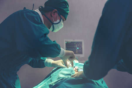 A surgeon and veterinarians team performing castration or sterilization operation on a cat in an animal hospital.