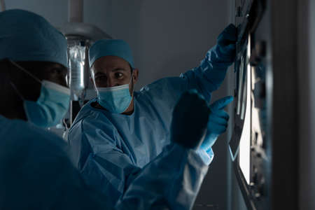 Diverse female doctors wearing face masks and surgical overalls looking at lung x-ray. medicine, health and healthcare services during coronavirus covid 19 pandemic.