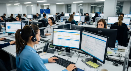 Financial analysts monitor stock market trends and data in a busy trading office during work hours
