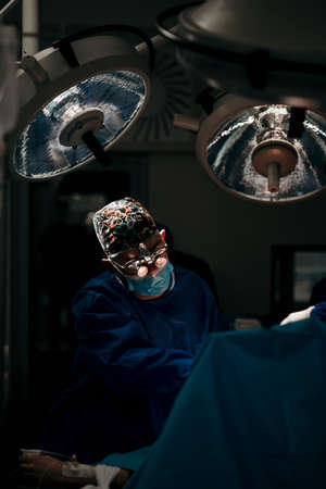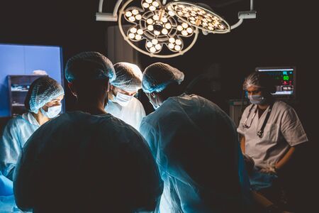 An international professional team of surgeon, assistants and anesthesiologist perform a complex operation on a patient under general anesthesia. Dark atmospheric photography theme in low key