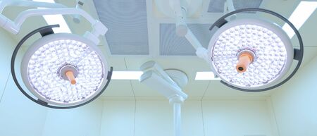 Two surgical lamps in operation room take with blue filter