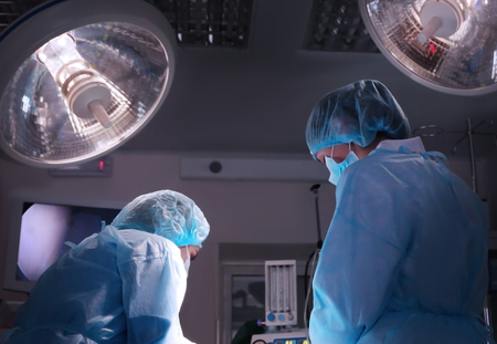 Team surgeon at work in operating room. Surgical light in the operating room. Preparation for the beginning of surgical operation with a cut. The surgeon is performing surgery on the patient.