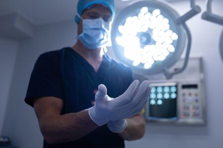 Low angle view of Caucasian male surgeon wearing surgical gloves in operation theater of hospital