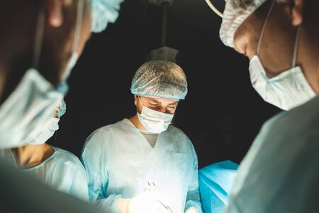 An international professional team of surgeon, assistants and anesthesiologist perform a complex operation on a patient under general anesthesia. Dark atmospheric photography theme in low key.