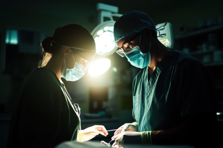 Surgeons focus intently on a delicate procedure under bright operating lights during a hospital surgery.