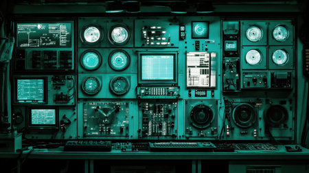 This image features a high-tech control panel filled with various instruments and screens, showcasing an advanced and sleek design in a dark-toned environment.