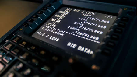 Barcelona, Spain - April 12, 2019 Close up of a flight management computer input and display. Modern jet airliner avionics in detail