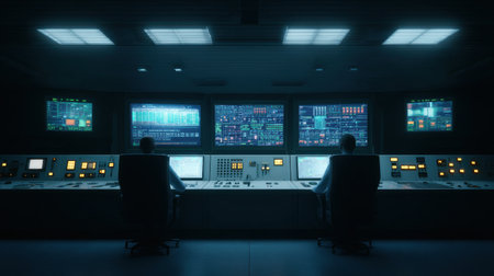 Engineers Working on a Large Control Panel in a Power Plant. AI generative