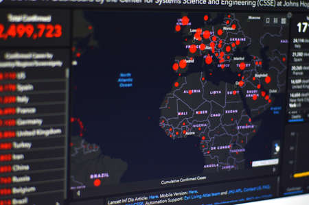 displays the development of the covid-19 outbreak throughout the official website on an online computer, Tarakan - Indonesia 21 April 2020