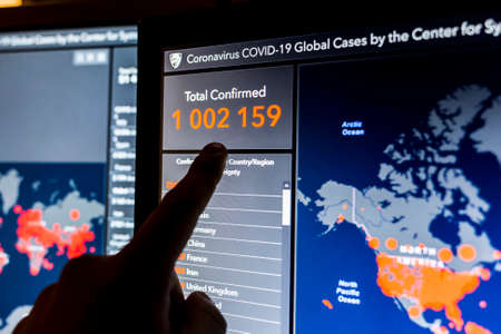 Over 1 million. Number of Total Confirmed Cases. Expert point Coronavirus COVID-19 global cases Map Johns Hopkins University map on monitor display.