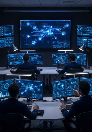 A dimly lit control room with multiple computer screens displaying data and graphs