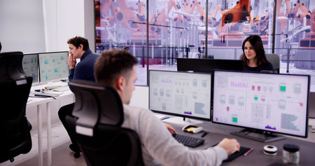 Team working on the System Control Room, Technical Operator Works at His Workstation with Multiple Displays, Security guards working on multiple monitors.