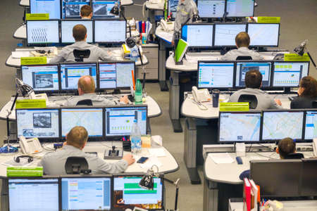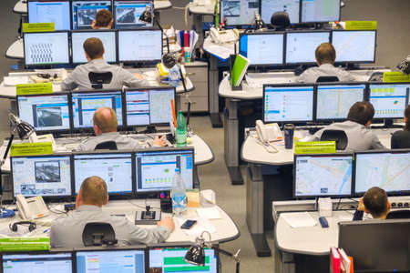 Group of security guards working on computers while sitting in the main control room, CCTV surveillance.