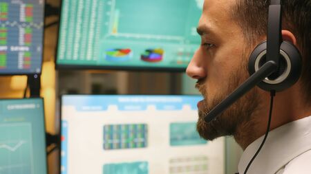 Zoom in shot of stock market trader talking with investors wearing headphones. Economy crash.