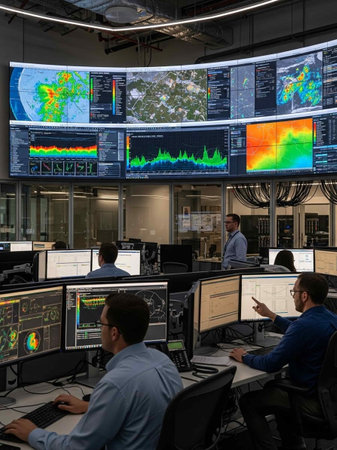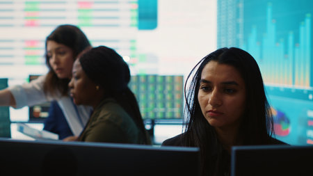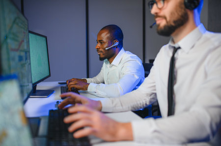 Group of Security data center operators working in a CCTV monitoring room looking on multiple monitors.Officers Monitoring Multiple Screens for Suspicious Activities