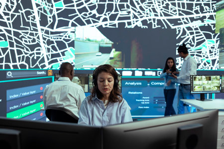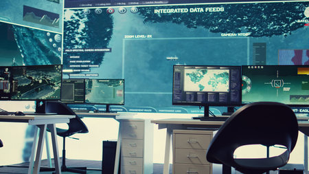 Government intelligence soldiers in a control room oversee surveillance missions, monitoring real time data and coordinating security measures, for national protection. Command post.