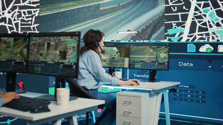 Call center employee communicating alternative routes for couriers, trying to avoid traffic by using satellite city map and surveillance CCTV footage. Operator gives gps directions. Camera A.