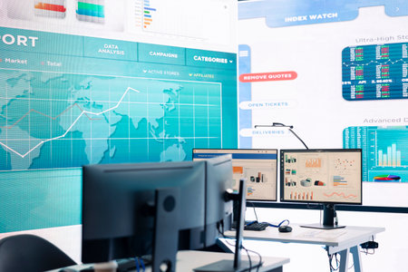 Multinational company headquarters office with a big data screen, technology used for employees to monitor numbers and infographics relevant to business development or expansion.