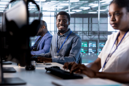 Admin in server hub next to colleagues tasked with protecting data against hacking attacks. African american worker and coworkers safeguarding data center against unauthorized access