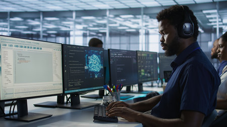 Admin in data center coding AI LLM chatbot software of virtual assistant answering user prompts using predictive technology. Worker building large language model program using artificial intelligence