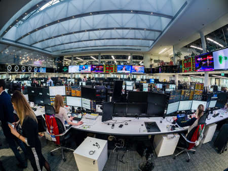 MOSCOW, RUSSIA - JAN 30, 2018: View to busy trading floor of the Sberbank CIB stock exchange in Moscow on Jan 30, 2018. It is the new largest trading floor in Europe with 4000 square meters area.