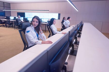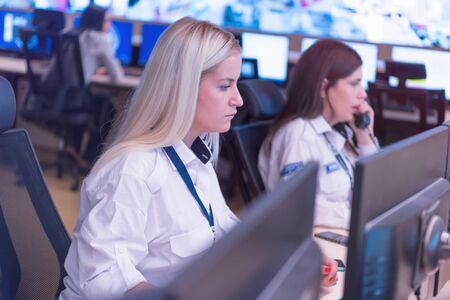 Group of security operators working in a data system control room Technical Operators Working at workstation with multiple displays, security guards working on multiple monitors in surveillan