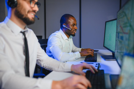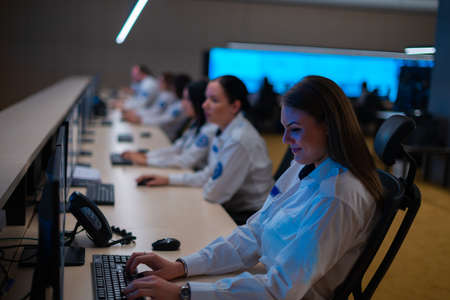 Group of Security data center operators working in a CCTV monitoring room looking on multiple monitors Officers Monitoring Multiple Screens for Suspicious Activities Team working on the System Contr