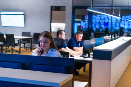 Female security guard operator talking on the phone, calling in the alarming event to the external team of field force agents.