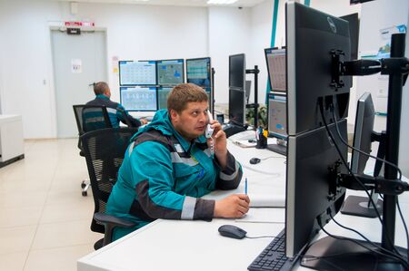 Tobolsk, Russia - July 23. 2019: Sibur company. Plant on processing of hydrocarbonic raw materials. Man in industrial control room using phone to give instructions