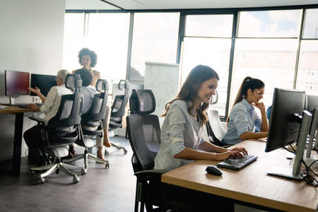 Successful happy woman working at office. Technology, computer, startup, business concept.