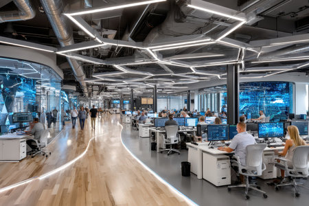 People work at computers in a bright, modern office with unique lighting