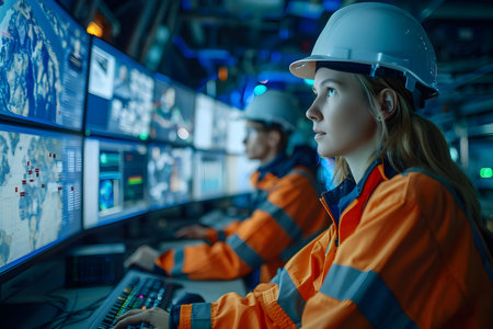 Engineers working together in advanced command center at mining site. Concept Mining Operations, Advanced Technology, Collaborative Engineering, Command Center, Industry Innovation,