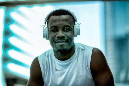 african-american man in sportswear in wireless headphones listening music and enjoying music on background of stairs